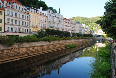 Karlovy Vary ou Carlsbad é uma cidadezinha termal, no meio de um vale e banhada por dois rios que formam um T: o Tepla e o Ohre (com uma falta de acentos malucos que os Checos usam). Fica muito próxima da fronteira alemã e de Praga chega-se facilmente de BUS em 2h 15 min. Para tal, aconselho a Student Bus. Por pouco mais de 5 € levam-vos, dão um filme e dão café e ainda vendem chocolates! Os rio permitem que a rua engalanada tenha pontezinhas de um lado para o outro. No Inverno deve ser de querer lá estar de sorriso na cara! Vi por acaso há pouco tempo uma comédia romântica com a Queen Latifah, penso chamar-se Last Holiday, em que KV era o local das filmagens e no Inverno. Delicioso.